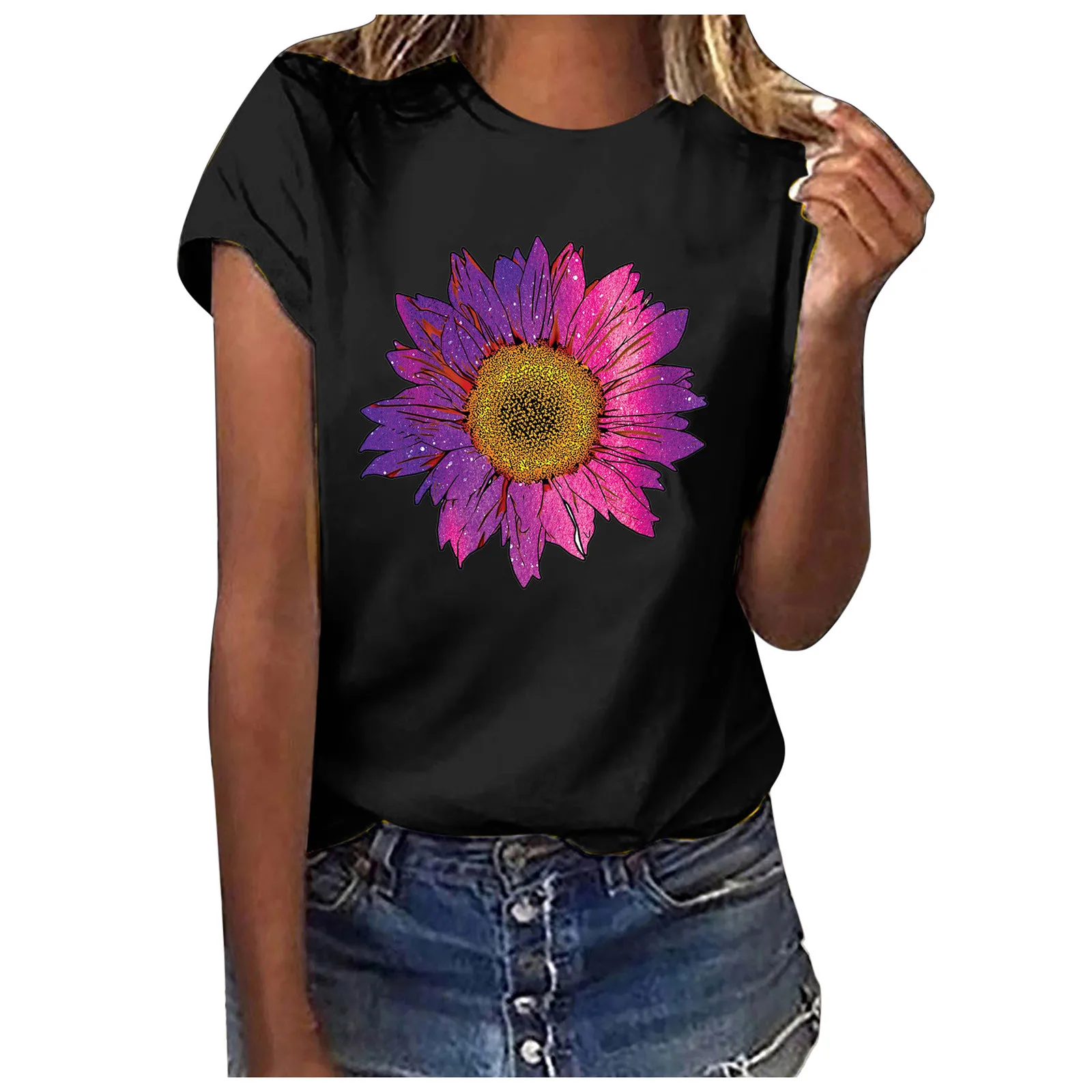 Womens Clothes Korean Lady's Casual Colorful Sunflower Print Round Neck T-shirt Short Sleeve Tops High Street Vintage Футболка